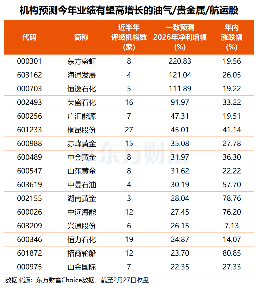 Data from Eastmoney’s Choice shows that, based on consensus forecasts from three or more institutions, a total of 16 oil & gas, precious metals, and shipping stocks are expected to see net profit growth of over 20% in 2026.
