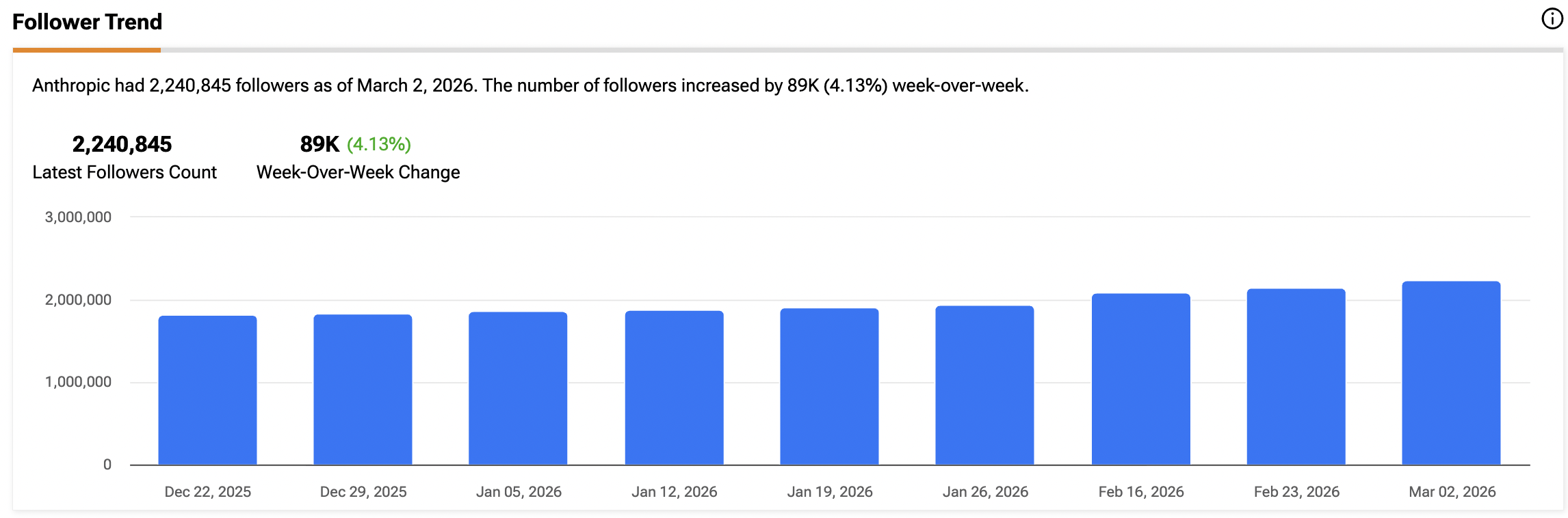 According to data from TipRanks, Anthropic’s follower base jumped to 2,240,845. This includes a 4.13% week-over-week increase, adding 89,000 new followers in just seven days. While the Pentagon is trying to build a wall against the company, Anthropic’s popularity is building a powerful public defense.