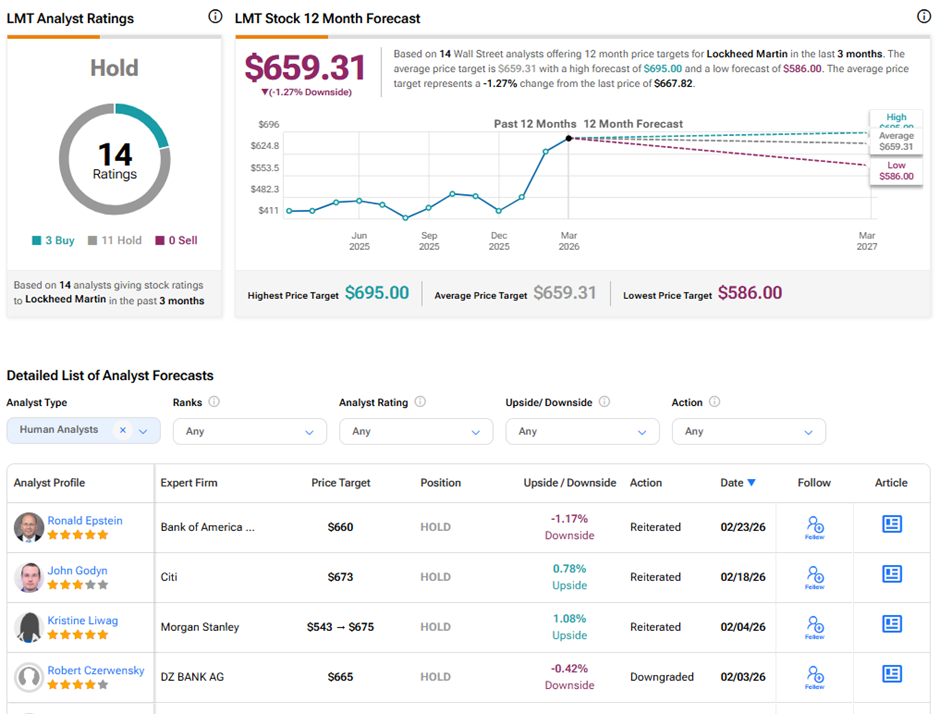 Analysts remain cautious about LMT’s long-term outlook. On TipRanks, LMT stock has a Hold consensus rating based on three Buys and 11 Hold ratings. The average Lockheed Martin price target of $659.31 implies 1.3% downside potential from current levels. Over the past year, LMT shares have surged 48.8%.