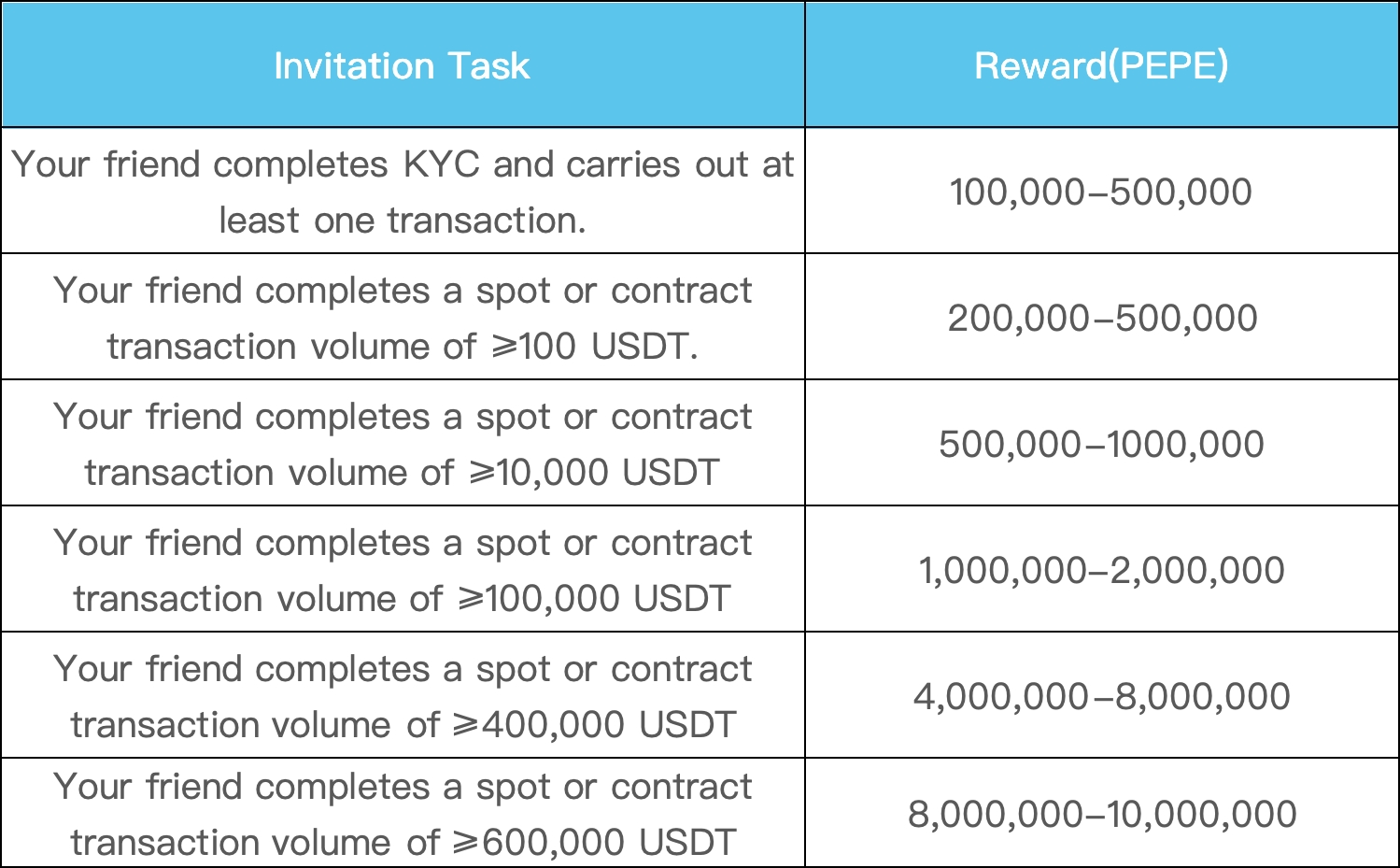 Durante o evento, você pode ganhar recompensas correspondentes convidando um amigo para completar as tarefas de convite exclusivas. Há um conjunto total de recompensas de lançamento aéreo de 2 bilhões de tokens PEPE, disponíveis por ordem de chegada! Copie rapidamente seu link de indicação e compartilhe-o com seus amigos! Detalhes a seguir: