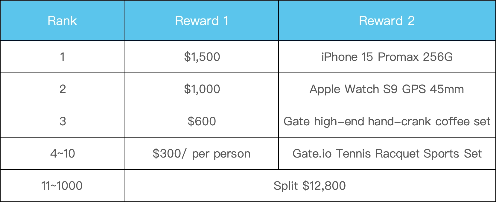 Acumule um volume de negociação de 3,000 USDT e ganhe uma parte de um prêmio de $18,000, com sua distribuição baseada na classificação no leaderboard. Além disso, os 10 melhores traders ganharão prêmios premium como o iPhone 15 Pro 256GB e um Apple Watch Series 9!