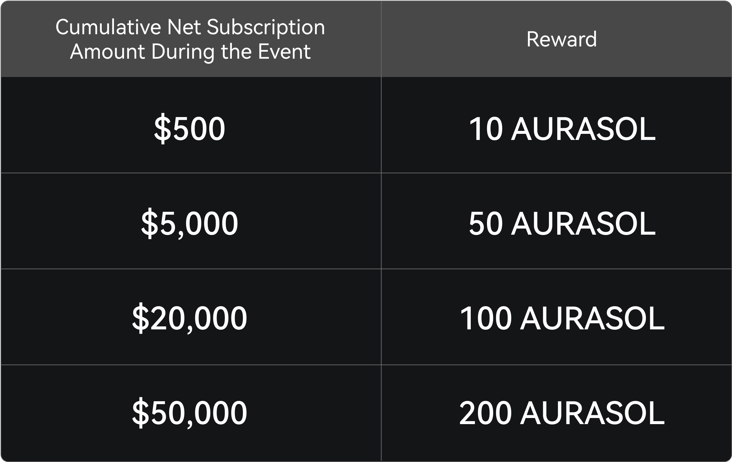 Durante o evento, os usuários que ativarem o Ganho automático pela primeira vez e o mantiverem ativado podem solicitar airdrops do AURASOL, com base no valor líquido acumulado da assinatura no Simple Earn. Cada usuário só pode reivindicar a recompensa de nível mais alto uma vez.