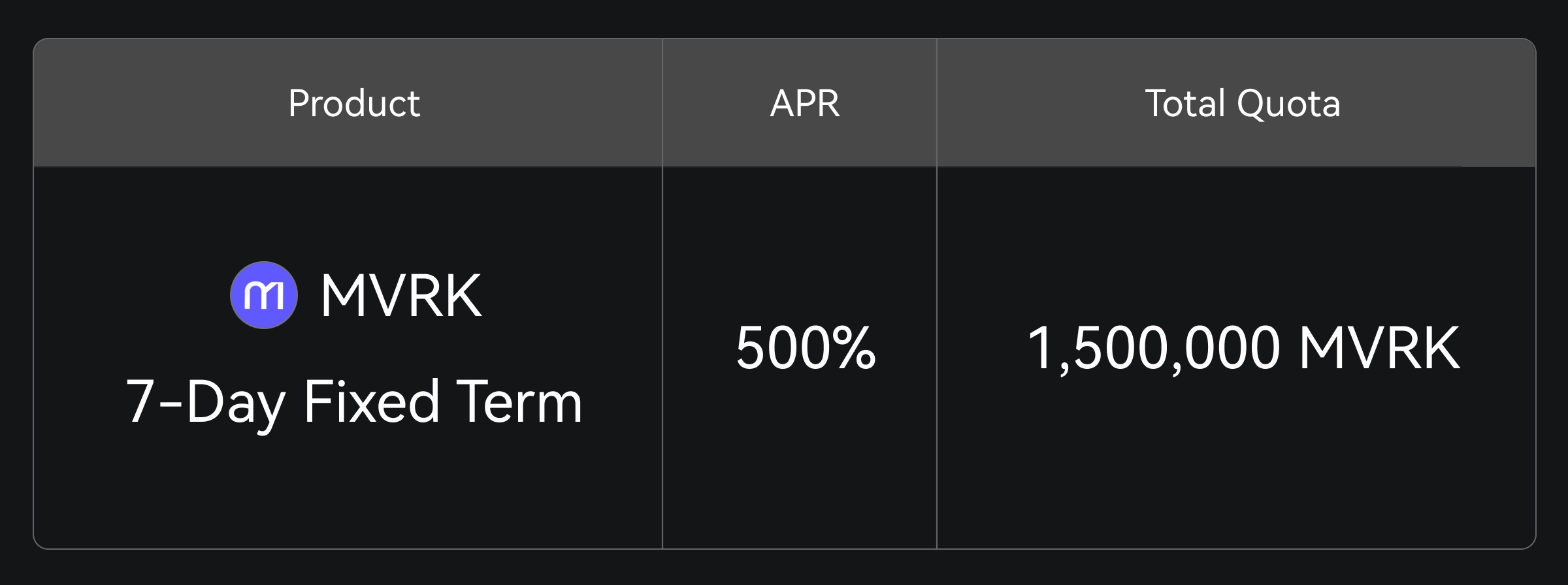 O Gate Simple Earn lançou o produto MVRK com prazo fixo de 7 dias, oferecendo até 500% de APR. Com uma alocação limitada de 1.500.000 MVRK disponível por ordem de chegada, não perca essa oportunidade.