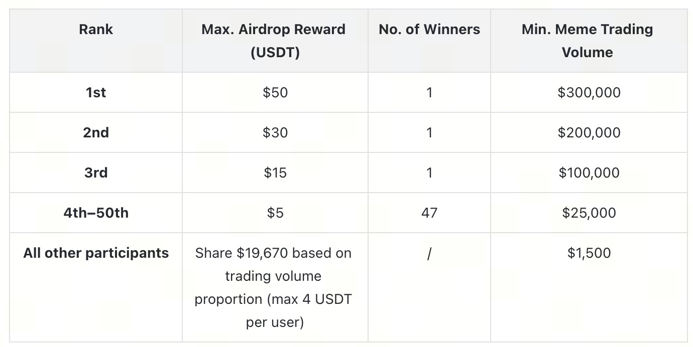- No Desafio da Tabela de Classificação, caso nenhum participante atinja o volume mínimo de negociação de Meme, as recompensas de airdrop correspondentes não serão distribuídas. Aqueles que cumprirem o requisito mínimo de volume de negociação serão classificados conforme a ordem em que atingirem o critério, e os primeiros 50 usuários receberão as recompensas fixas da tabela de classificação, em sequência.