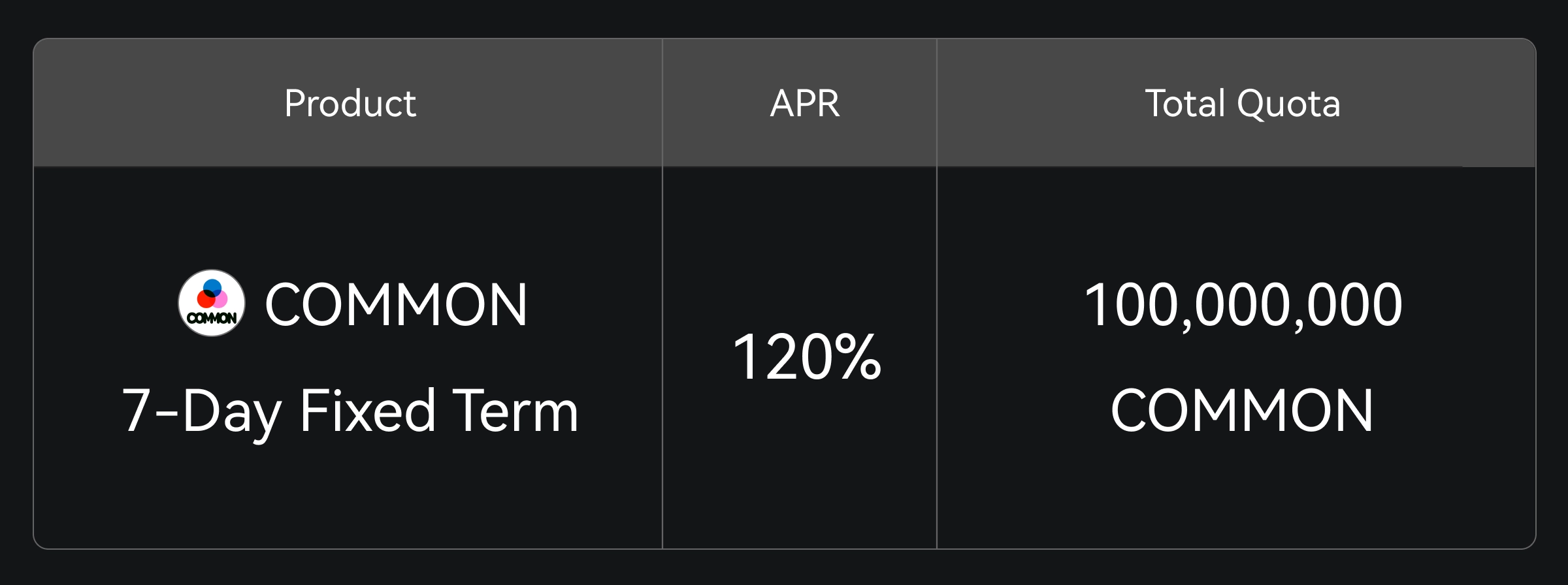 Gate Simple Earn está oferecendo, por tempo limitado, o plano COMMON com prazo fixo de 7 dias e APR de 120%. O fornecimento total é de 100.000.000 COMMON, disponível enquanto durarem os estoques.