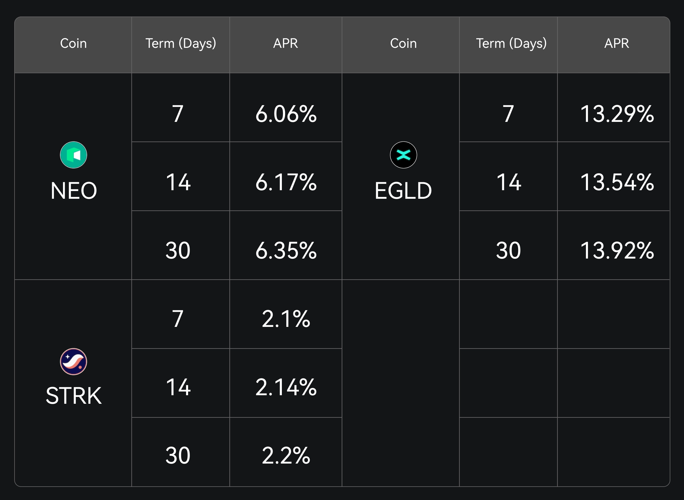 Gate Simple Earn lançou oficialmente os produtos de prazo fixo de NEO, EGLD e STRK, oferecendo períodos de bloqueio flexíveis de 7, 14 e 30 dias. Não perca — assine agora.