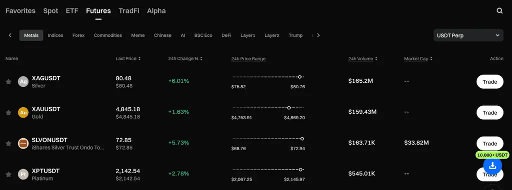 A secção de metais da Gate oferece contratos perpétuos de USDT para ouro e prata, permitindo aos utilizadores acompanhar as variações de preço e abrir posições na mesma plataforma.