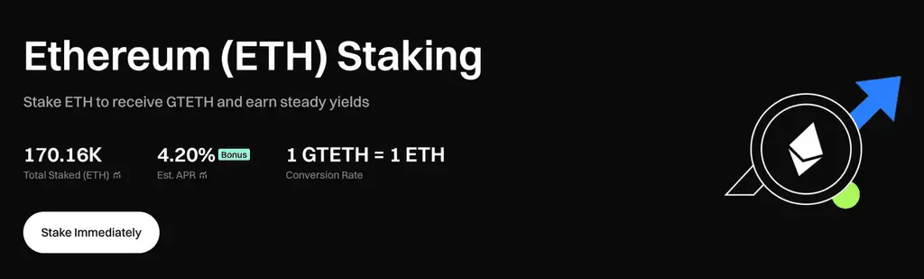 Com os serviços de staking via plataforma, todo o processo fica mais simples. Os usuários só precisam depositar ETH no mecanismo de staking para participar dos rendimentos da rede, sem precisar manter seus próprios nós. Além disso, o GTETH é totalmente apoiado por reservas de ETH, com cada token correspondendo a ETH real staked, tornando a estrutura de ativos mais transparente.