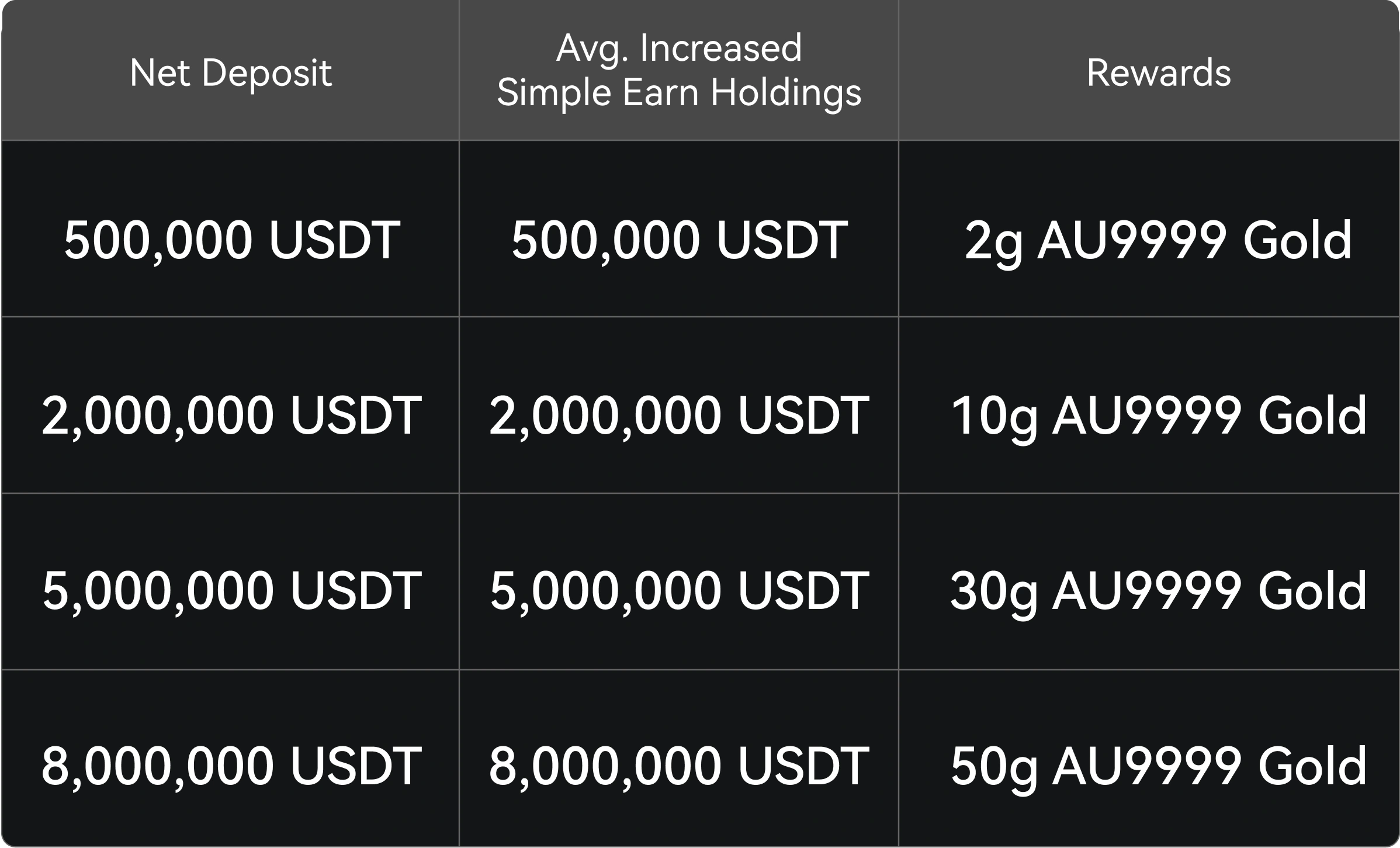 Os utilizadores elegíveis que se registarem na Festa de ganhos VIP a 22 de agosto e completarem um depósito líquido de 8 000 000 USDT, mantendo uma média de 8 000 000 USDT em Simple Earn durante 30 dias (22 de agosto – 20 de setembro), receberão 50g de ouro AU9999 e uma oportunidade de ganhar um bilhete para o festival de música Token of Love.