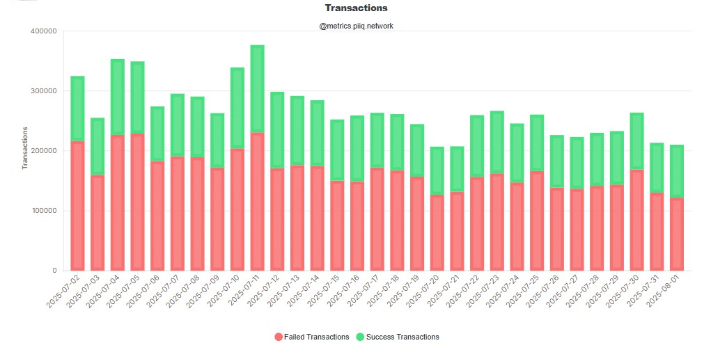 Во-вторых, в Pi Network в последнее время было много неудачных сделок. Согласно данным PiDoor, только 122000 сделок были успешными, в то время как количество неудачных сделок достигло 88300, что составляет более 58%. Кроме того, общий объем торгов в августе также снизился по сравнению с июлем, что отражает снижение активности пользователей.