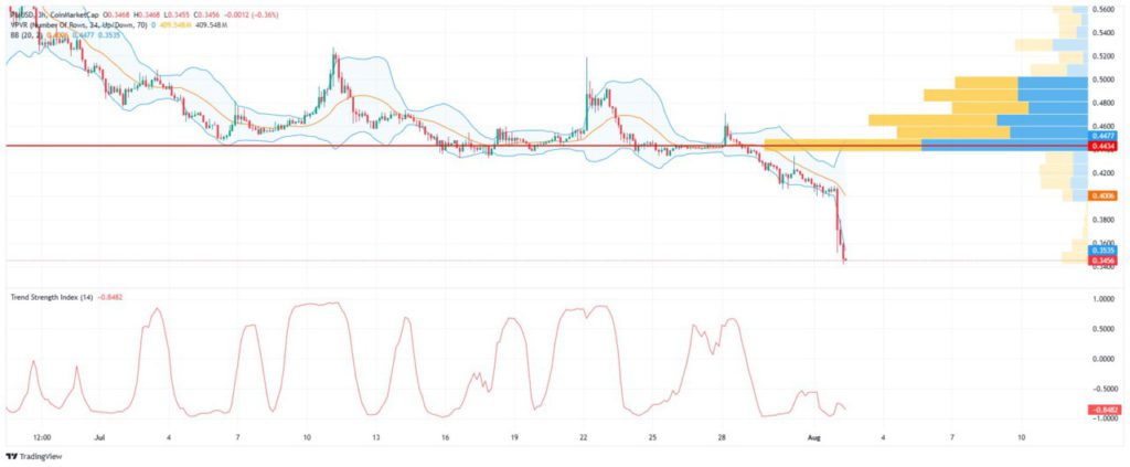Под влиянием распродаж 24-часовой объем торгов PI резко увеличился до 159 миллионов долларов. Индикатор объема VPVR показывает, что диапазон от 0,44 до 0,50 долларов ранее был основной зоной интенсивной торговли, но в настоящее время цена значительно упала ниже этого уровня. Расширение полосы Боллинджера указывает на дальнейшее усиление волатильности на рынке, и в краткосрочной перспективе цена может продолжить искать дно.