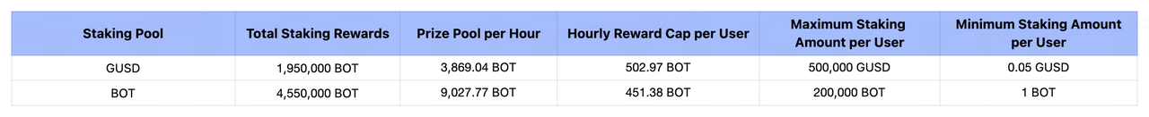 How to Participate: Log in to your Gate account and complete Identity Verification - Navigate to [Launchpool] - Hold at least 0.05 GUSD / 1 BOT - Click [Stake].