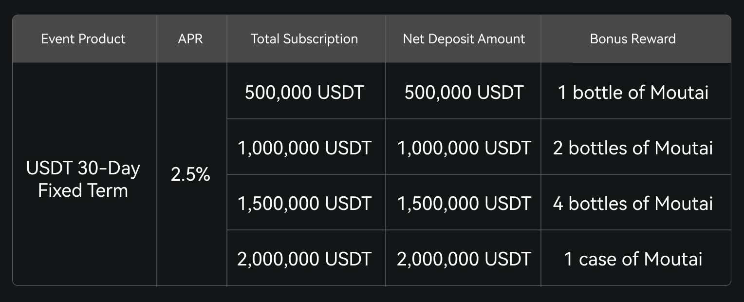 Event 3: 2.5% APR on USDT Fixed Term & Moutai Feitian