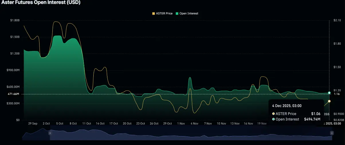 However, despite announcing this ambitious roadmap, individual investor interest in ASTER remains rather modest. This is reflected in the Open Interest (OI) metric in the derivatives market, which only averaged $495,000 on Friday—a sharp drop from the $1.19 million peak recorded on October 10.