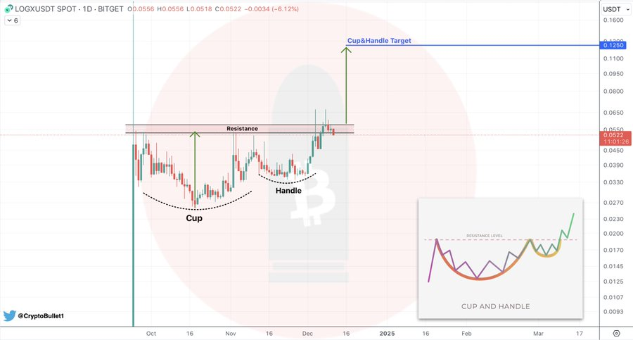 According to the CryptoBullet chart, LOGX forms a clear cup and handle pattern during the daily timeframe. The cup shows a rounded decline and recovery, while the handle exhibits minor retracements below the resistance zone at approximately $0.062. Price action indicates an attempted breakout from the resistance level as the target from the breakout aligns with $0.125.
