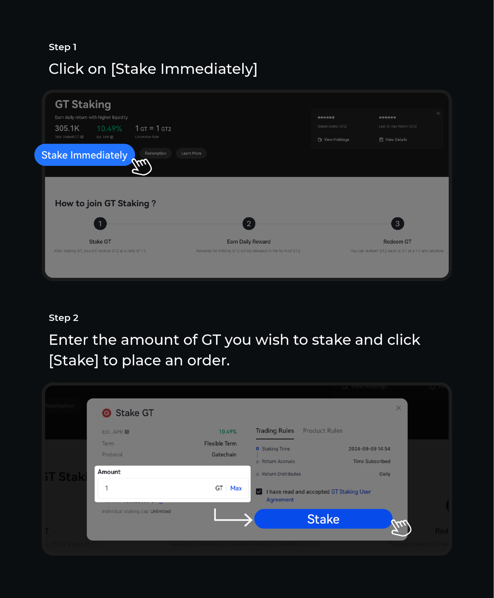GT Staking — це процес, який дозволяє власникам GT брати участь у консенсусному механізмі блокчейну Proof of Stake (PoS) Gate та отримувати винагороди, ставлячи свої GT.