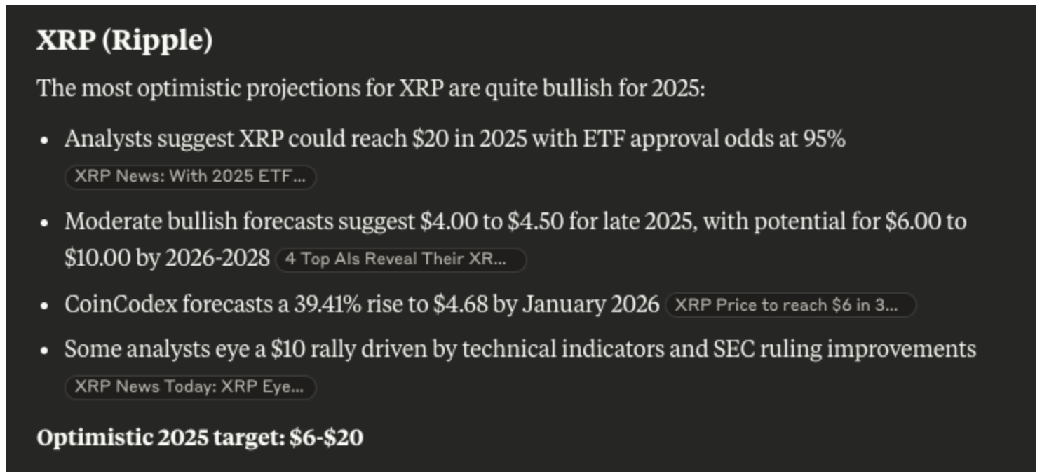 Claude AI прогнозує, що як лідер у сфері міжнародних платежів, XRP (XRP) може досягти 20 доларів до кінця 2025 року, що означає більше ніж 6-кратне зростання в порівнянні з його поточною ціною близько 3.22 доларів.