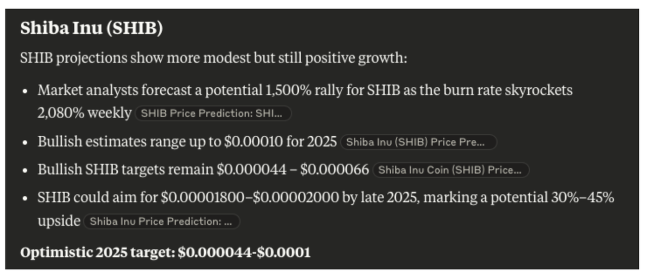 Основний рівень опору знаходиться поблизу 0.000022 доларів, потенційна ціль для зростання може досягти 0.00003 доларів. Якщо поточна динаміка збережеться, Клод прогнозує, що SHIB може досягти 0.0001 доларів до кінця року, що на дещо більше ніж в 7 разів перевищує поточний рівень.