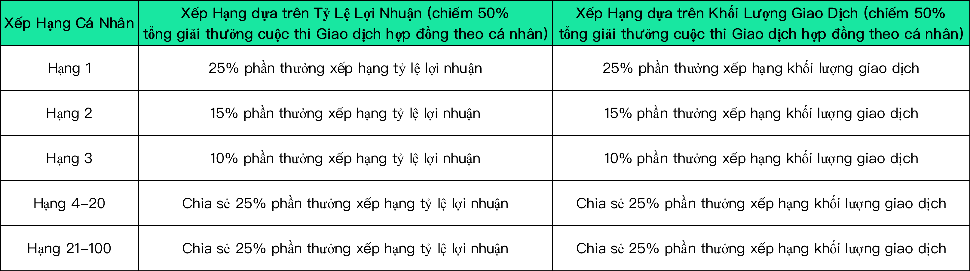 Trong thời gian diễn ra cuộc thi, người dùng tham gia cuộc thi giao dịch hợp đồng theo cá nhân trong một khu vực thi đấu, Trong đó xếp hạng theo [Tỷ lệ lợi nhuận hợp đồng] chiếm 50% tổng giải thưởng thi đấu cá nhân, và xếp hạng theo [Khối lượng giao dịch hợp đồng] chiếm 50% tổng giải thưởng thi đấu cá nhân, quy tắc cụ thể như sau: