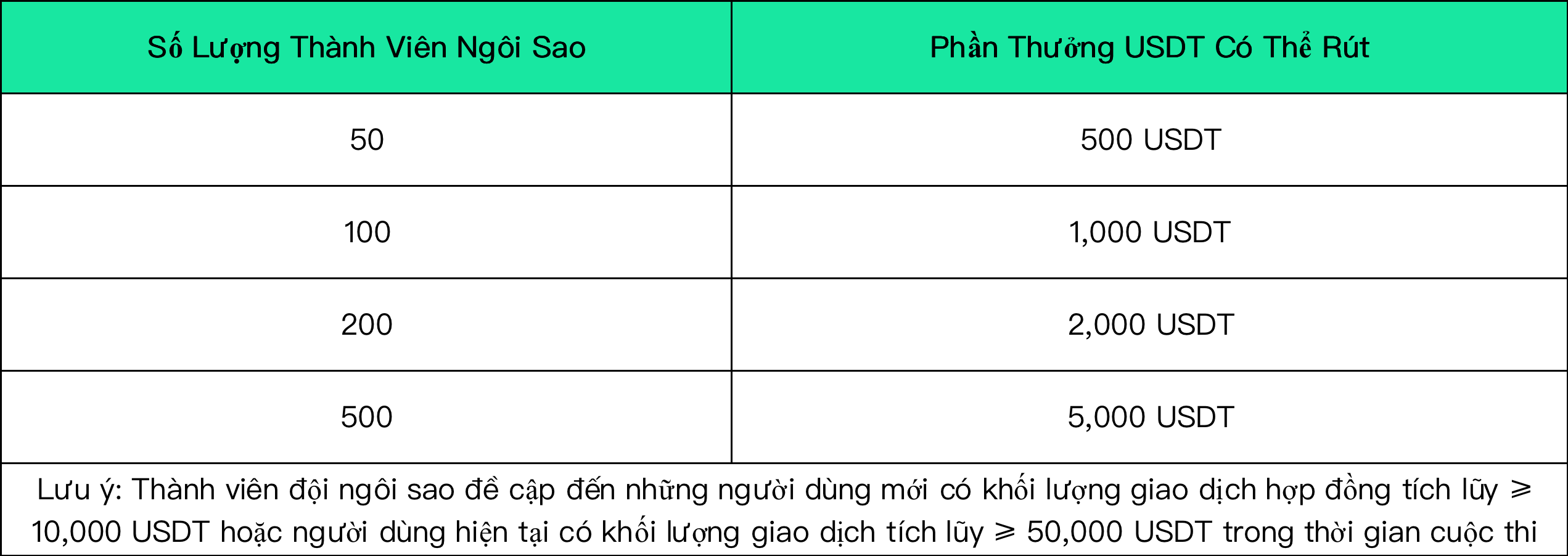 Khi các thành viên ngôi sao trong đội đạt đến một quy mô nhất định, đội trưởng ngôi sao sẽ nhận được thêm phần thưởng USDT. Thể lệ cụ thể như sau: