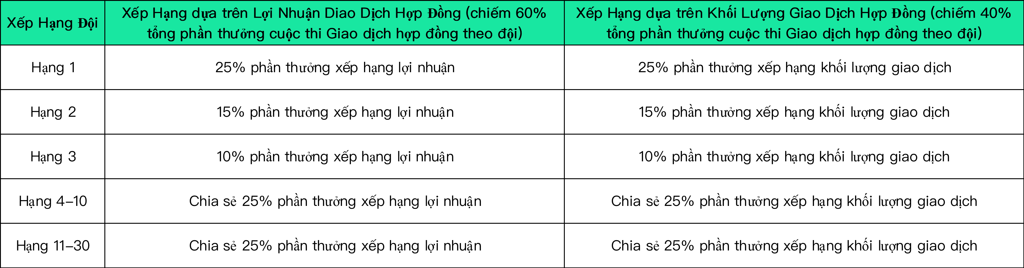 (1) Trong thời gian diễn ra cuộc thi, các đội tham gia trong một khu vực thi đấu sẽ được xếp hạng theo [lợi nhuận hợp đồng] và [khối lượng giao dịch hợp đồng] của họ, trong đó các đội được xếp hạng theo lợi nhuận hợp đồng chiếm 60% tổng giải thưởng của khu vực thi đấu. các đội được xếp hạng theo khối lượng giao dịch hợp đồng chiếm 40% tổng giải thưởng của khu vực thi đấu, các quy tắc cụ thể như sau:
