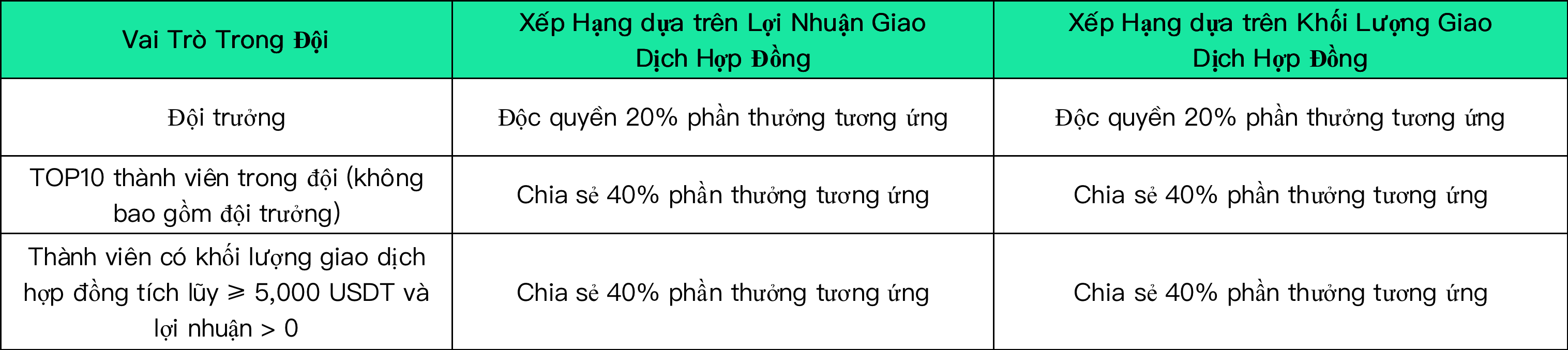 10.Đối với đội đã giành được phần thưởng của cuộc thi giao dịch hợp đồng theo nhóm, khi phần thưởng nội bộ được phân phát, trưởng nhóm sẽ không tham gia vào việc phân phối phần thưởng giữa các thành viên trong đội. Số lượng đội tham gia tối thiểu không được ít hơn 5 người và không có giới hạn trên cho số lượng tối đa.