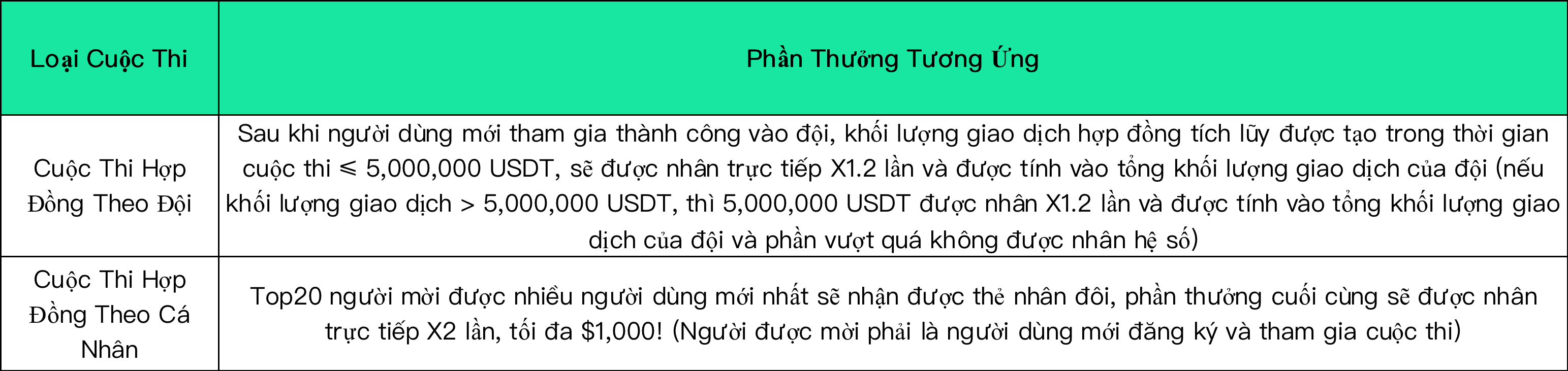 9.Trong thời gian diễn ra sự kiện, những người chiến thắng trong cuộc thi theo giao dịch hợp đồng theo nhóm, cuộc thi giao dịch hợp đồng theo cá nhân và phần thưởng của những hoạt động khác phải đáp ứng khối lượng giao dịch hợp đồng ≥ 5.000 USDT trong thời gian diễn ra cuộc thi chính thức; phần thưởng dành cho người đăng ký sớm sẽ được phát hành trong vòng 5 ngày sau khi đăng ký sớm đăng ký kết thúc.