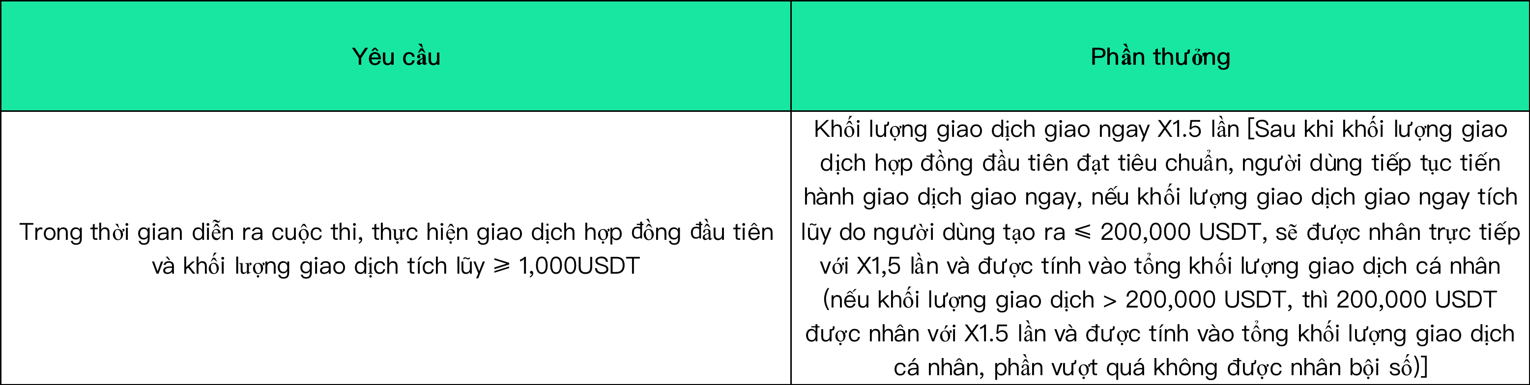 1.Tham gia xếp hạng cuộc thi giao dịch giao ngay cá nhân, khối lượng giao dịch tích lũy của cá nhân trong thời gian thi đấu phải ≥ 10.000 USDT;