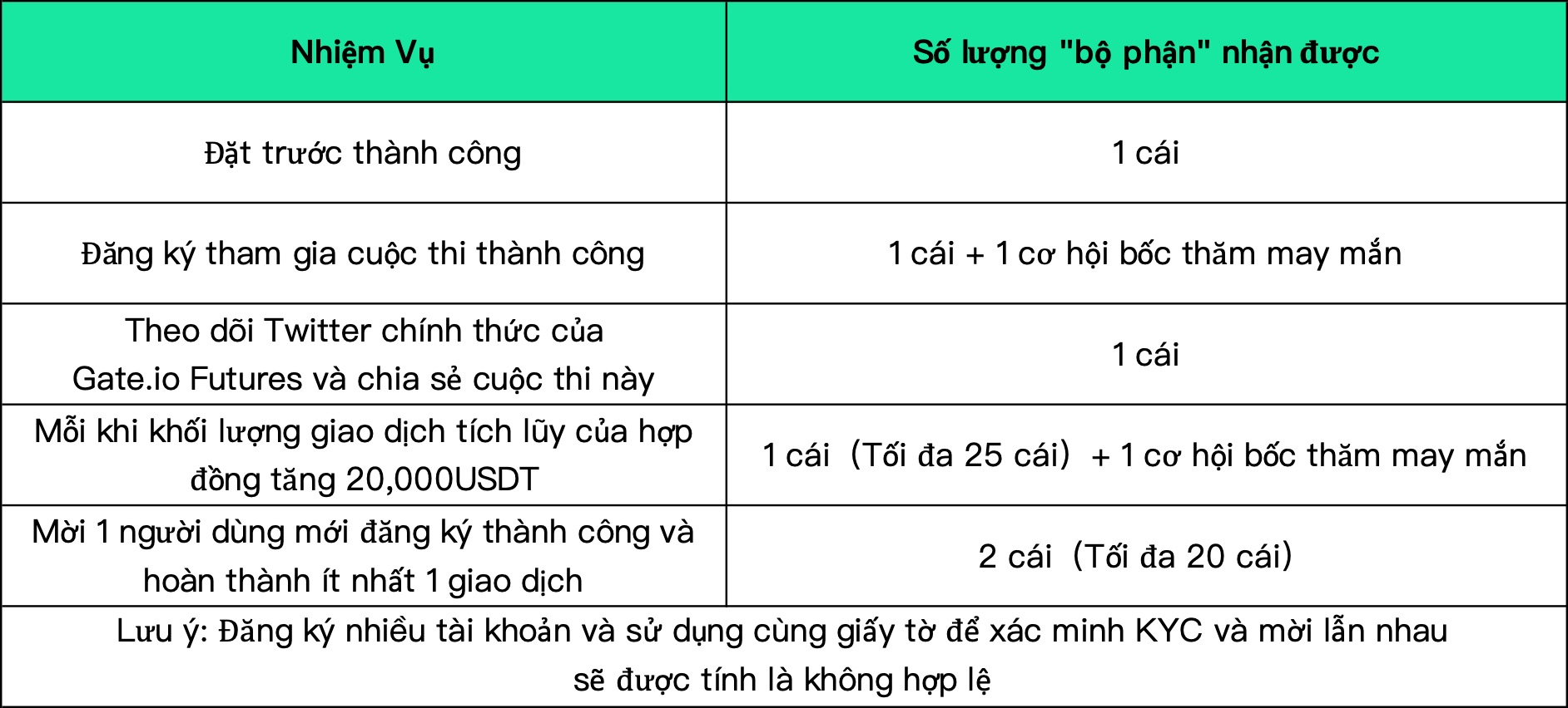 Trong thời gian diễn ra cuộc thi, người dùng đăng ký thành công cuộc thi có thể nhận được tối đa 1 cơ hội rút thăm may mắn; mỗi tăng 20.000 USDT trong khối lượng giao dịch tích lũy của hợp đồng cũng có thể nhận được 1 cơ hội rút thăm may mắn, xác suất trúng thưởng 100%; mỗi người được nhận tối đa 11 cơ hội bốc thăm trong suốt thời gian diễn ra cuộc thi (Bao gồm 1 cơ hội bốc thăm khi đăng ký thành công).