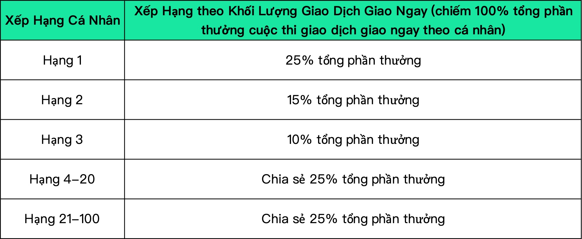 (1) Trong thời gian diễn ra cuộc thi, người dùng tham gia các cuộc thi giao ngay cá nhân trong một khu vực thi đấu sẽ được xếp hạng theo [khối lượng giao dịch giao ngay]. Cụ thể như sau: