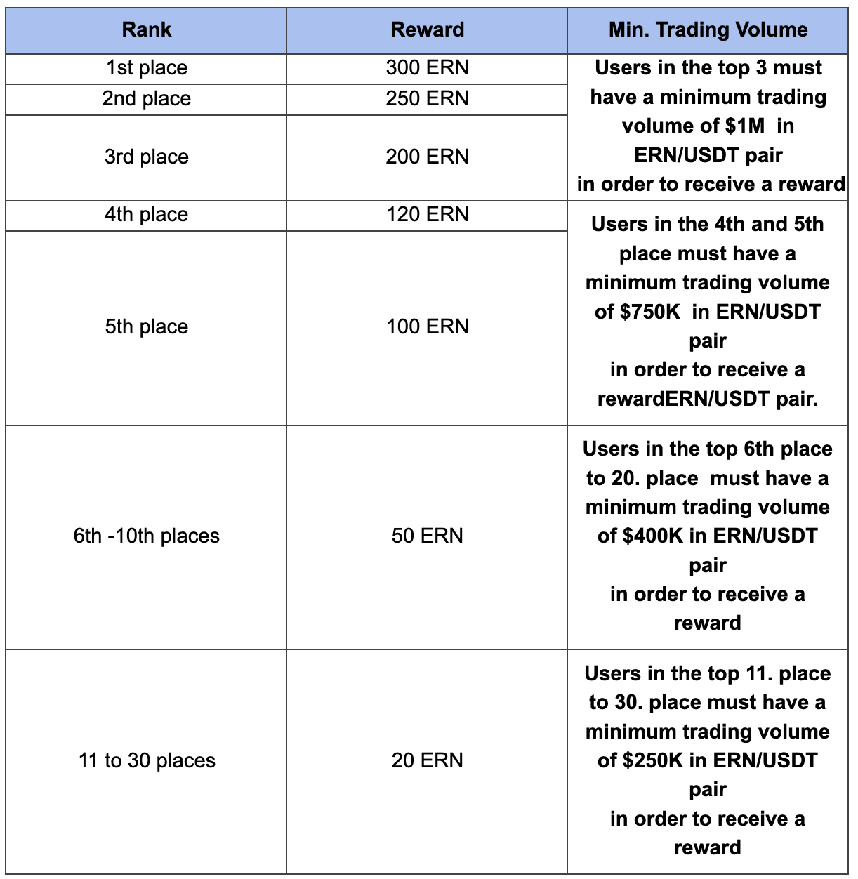 Participants must reach a trading volume of at least $15,000 in ERN/USDT