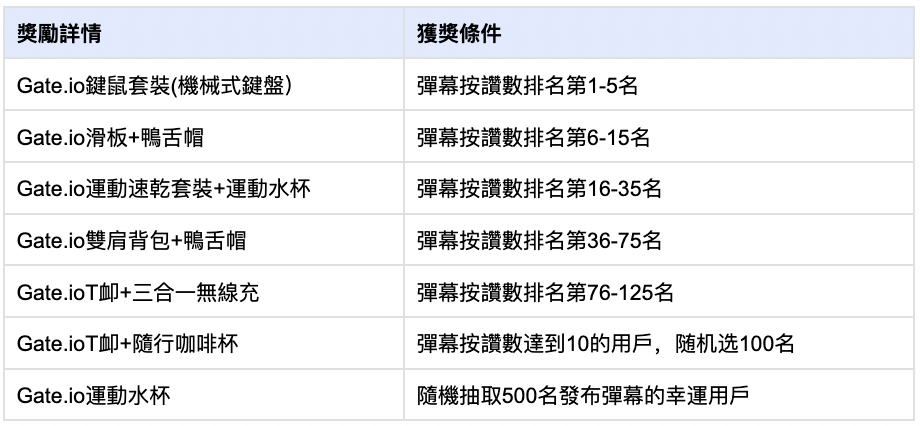 2.若用戶發布彈幕,則按點讚數最高的一條進行統計,每位用戶最多可獲得一個獎項。 若按讚數排名出現並列的情況,則按發佈時間先後進行排序,排在並列按讚數以後的名次依次向後排,點讚數統計截止時間為6月21日07:59 (UTC+8 ) ;若符合條件的用戶未達到獎勵名額上限,則按讚數要求依序降低至下一門檻;活動期間的優質彈幕將在Gate官方推特、Gate News進行公示。 透過不公平競爭的行為,如透過打賞誘導他人按讚等,將失去獲獎資格。