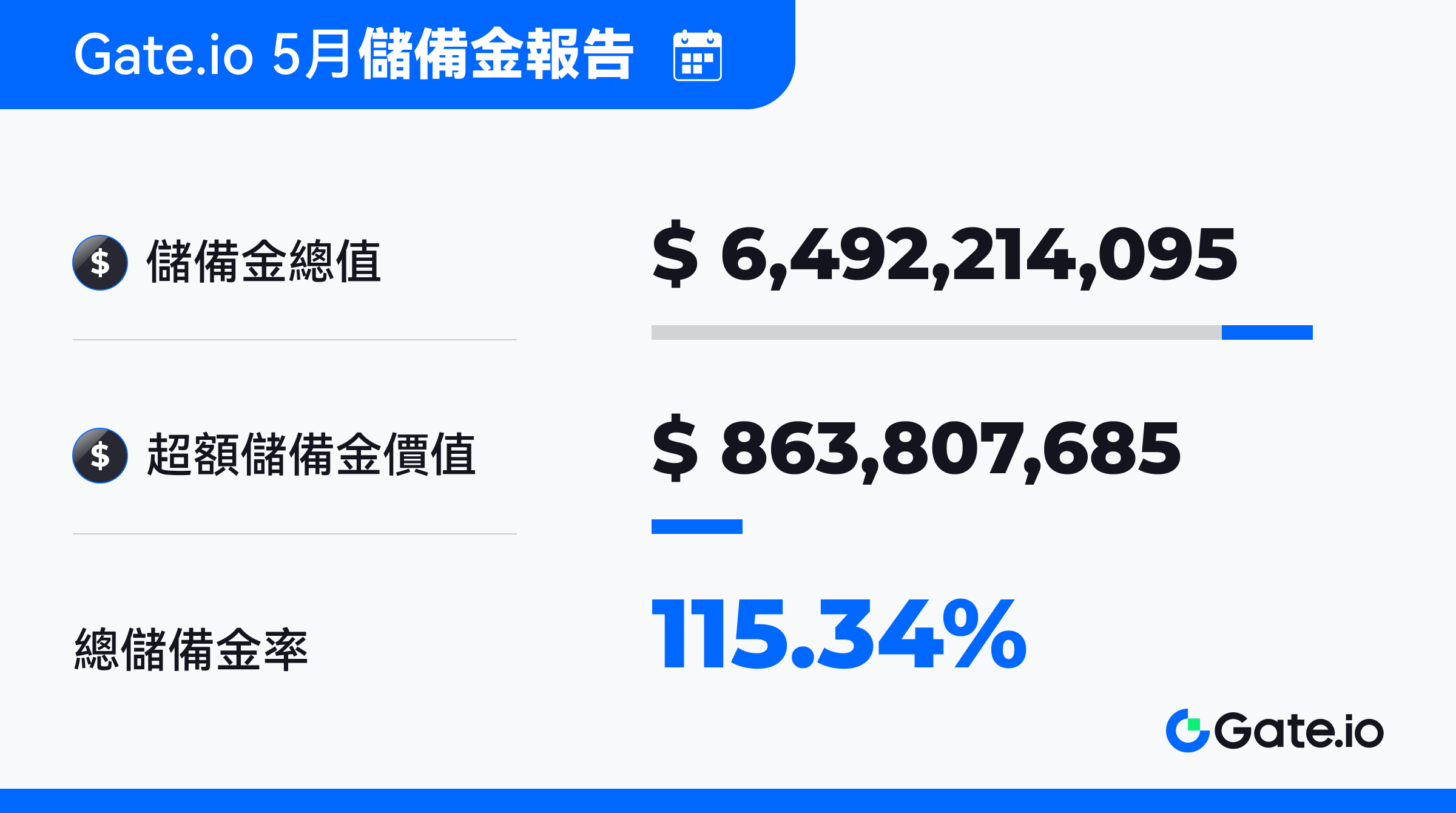 最新数据显示,截至 2024 年 5 月20日,Gate 的储备金率高达 115.34%,储备金总额达到 6,492,214,095 美元。同时,额外储备金也实现稳健增长,高达 8.63 亿美元。