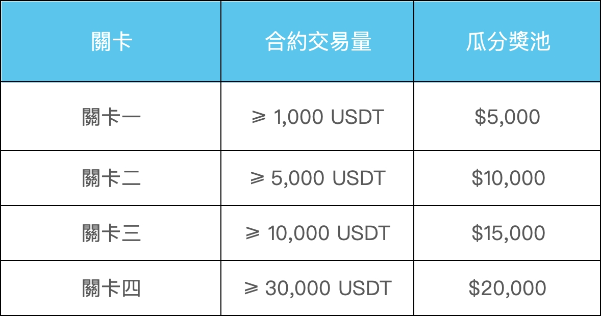 活動期間,所有新老用戶完成指定關卡的合約累計交易量,即可瓜分總獎池高達$50,000!同時,所有報名用戶,累計合約交易量 ≥ 3,000 USDT,將有機會抽取神秘寶箱。抽中神秘寶箱的用戶將獲得價值超過$100的Start up熱幣空投大禮包,領獎方式將在彈窗或郵件中詳細說明。