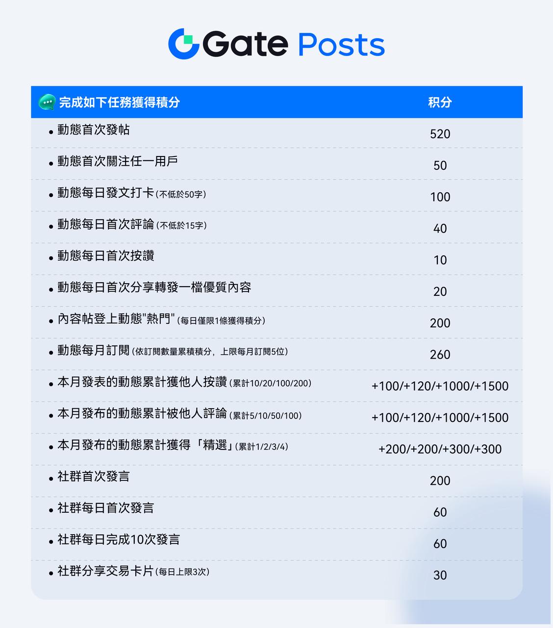完成如下發文、留言、按讚、發言等任務,即可獲得對應的榮譽點數。