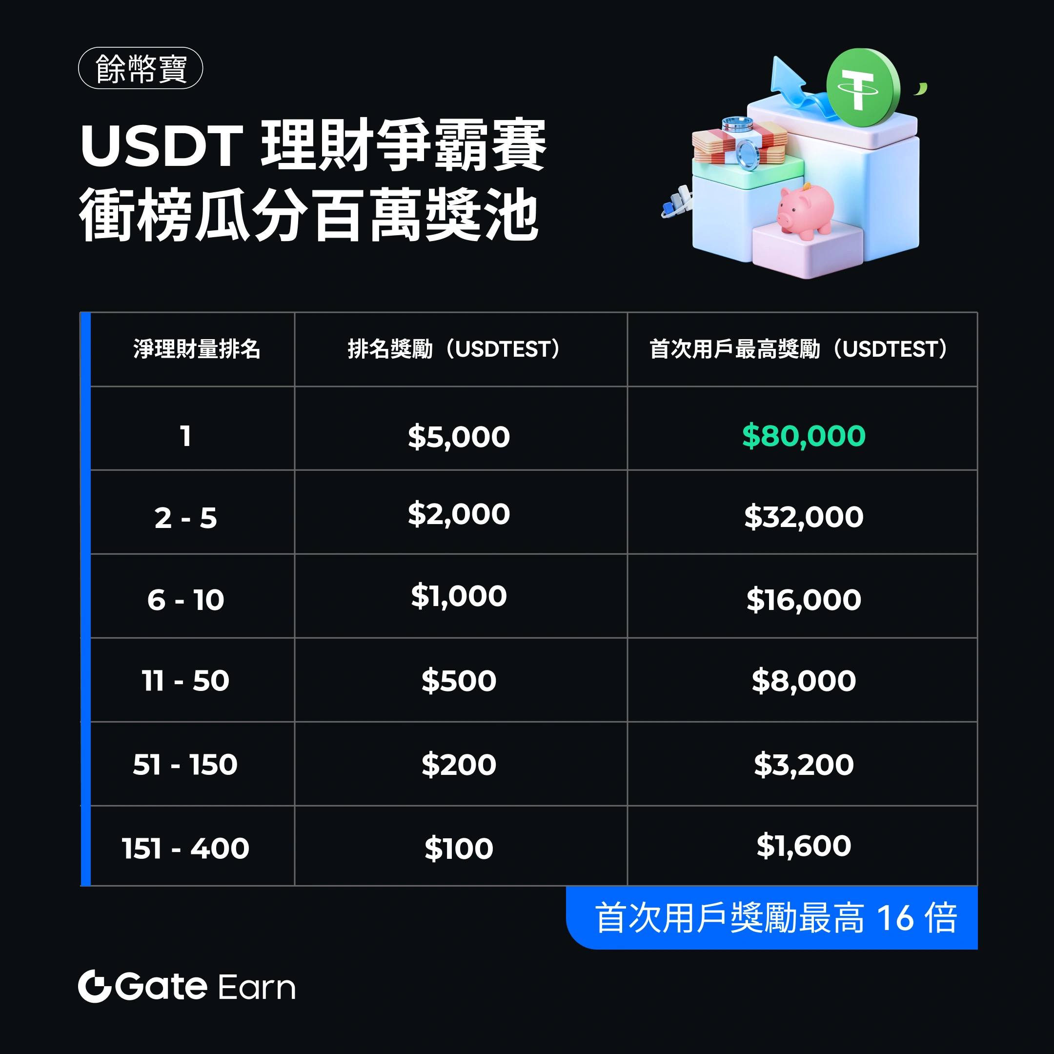 Gate 餘幣寶 USDT 理財爭霸賽限時開啟,凡報名活動且參與餘幣寶 USDT 活期及定期產品申購,淨理財量排名前 400 名的用戶即可瓜分百萬獎池。餘幣寶首次用戶最高可享 16 倍加成,最高贏取 $80,000 USDTEST 獎勵。