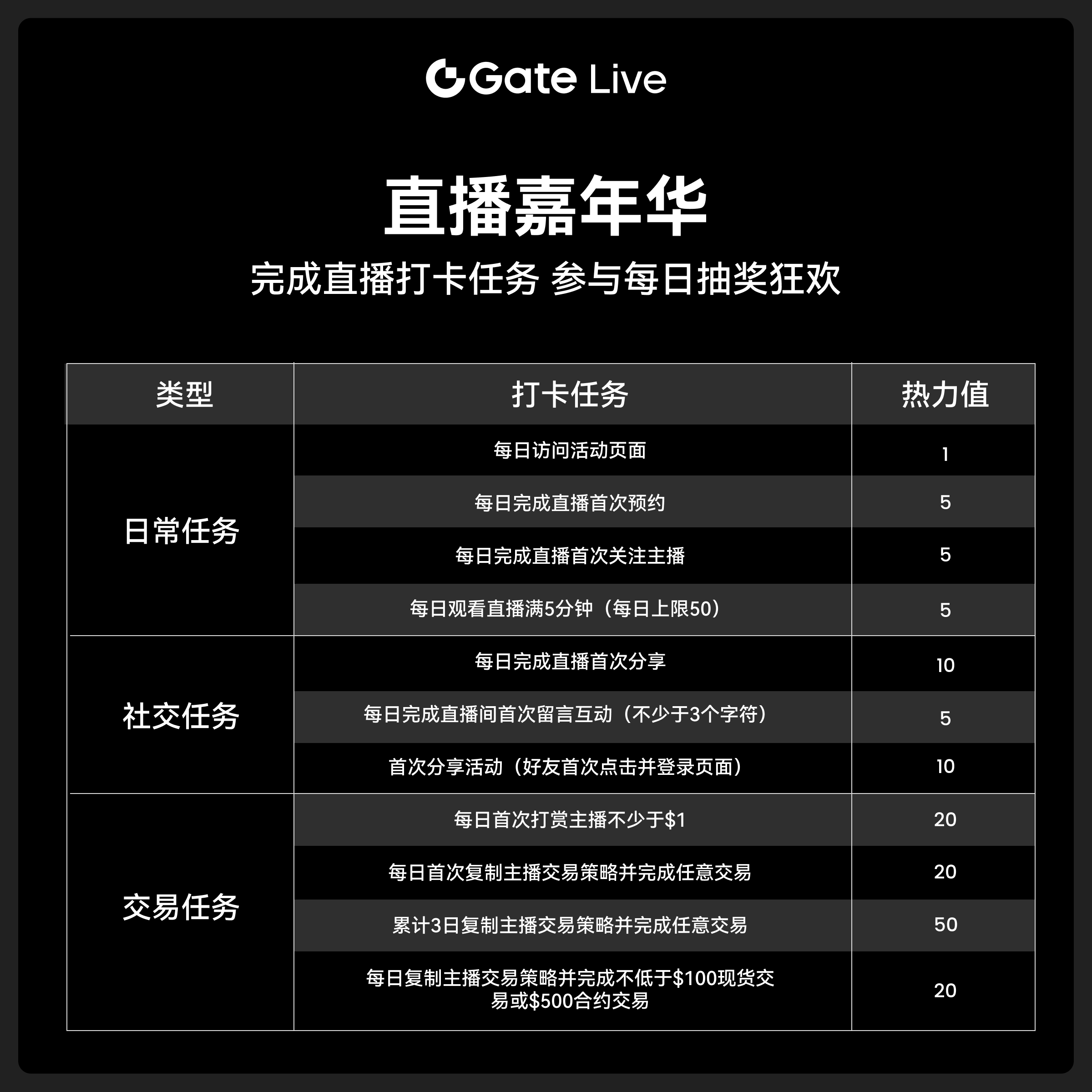 參與 Gate Live 直播每日打卡任務,積極觀看直播並與主播互動,GT、精美週邊、合約體驗券等多重驚喜好禮等你來贏。