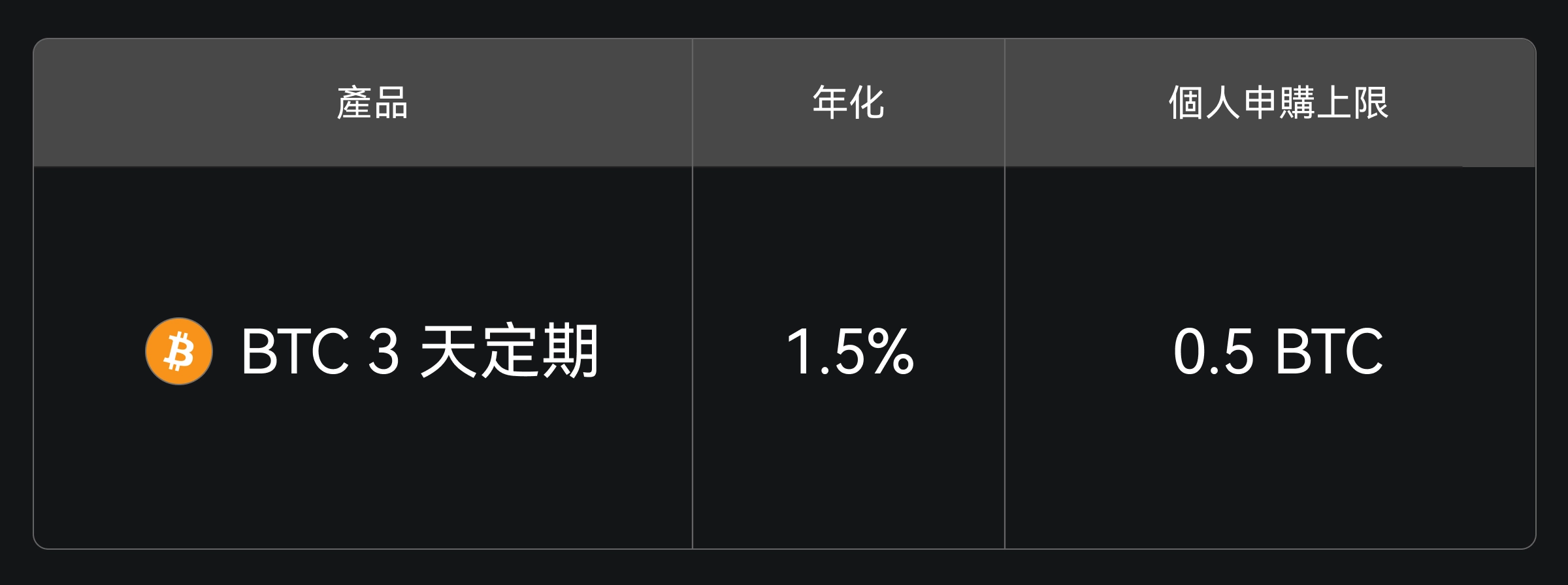 活動一:BTC 3 天定期理財年化達 1.5%,額度有限,先到先得。