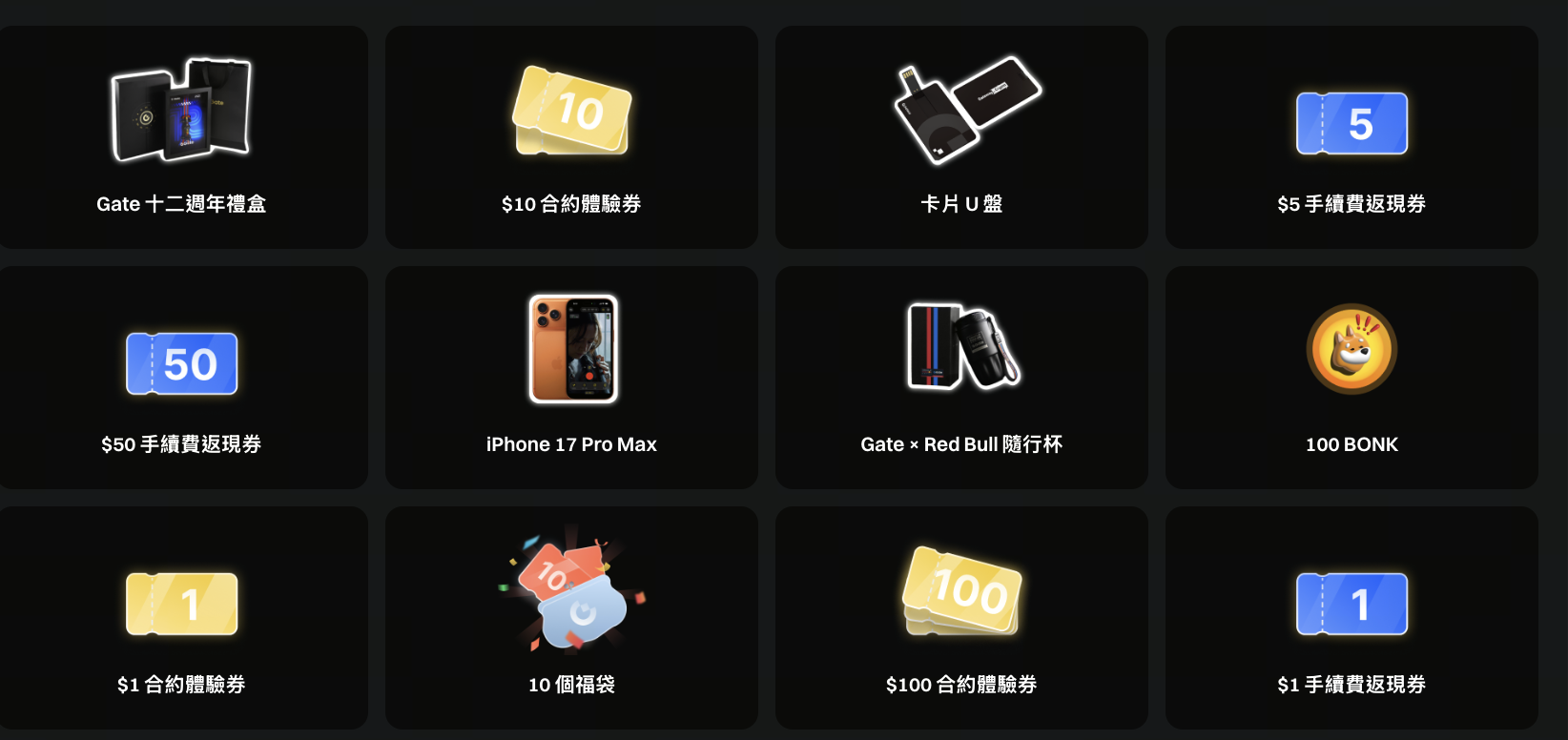 - 合約體驗券、代幣、福袋等獎勵將在活動結束後 30 個工作日 內完成發放,請及時查收您的帳戶。周邊和實物獎勵將在活動結束後 60 日 內,審核符合發獎條件後自動完成空投發放,請注意留意物流信息;若因物流原因導致獎勵無法送達,周邊獎勵將以等值合約體驗券形式發放,其中 iPhone 17 Pro Max 以 $1,000 合約體驗券,Gate 十二週年禮盒 以 $200 合約體驗券,Gate × Redbull 隨行杯 以 $30 合約體驗券,卡片 U 盤 以 $20 合約體驗券發放。