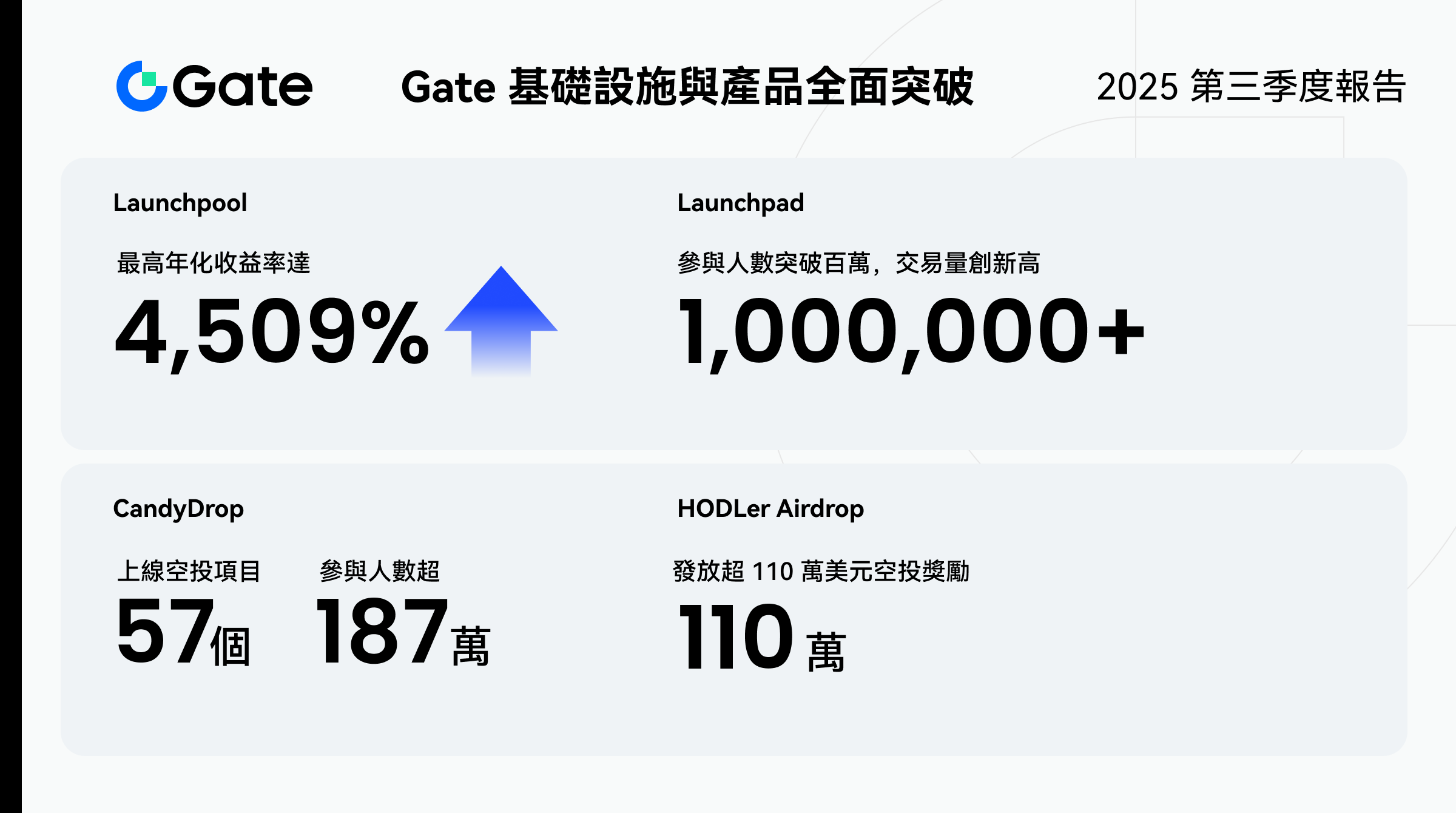 2025 年第三季度,Gate 在基礎設施、產品矩陣與生態協同層面實現全面突破。核心基礎設施 Gate Layer 正式上線,憑藉高性能 OP Stack 架構與 GT 質押機制,構建安全高效的二層網路體系,推動 GT 生態價值重塑;依託該網路,Gate Perp DEX 與 Gate Fun 等創新產品相繼登場,分別在去中心化永續合約交易與鏈上發射平台開創全新體驗。與此同時,Launchpool、Launchpad、CandyDrop 與 HODLer Airdrop 四大激勵產品同步升級,高收益項目與靈活機制顯著提升用戶參與度與生態活躍度。