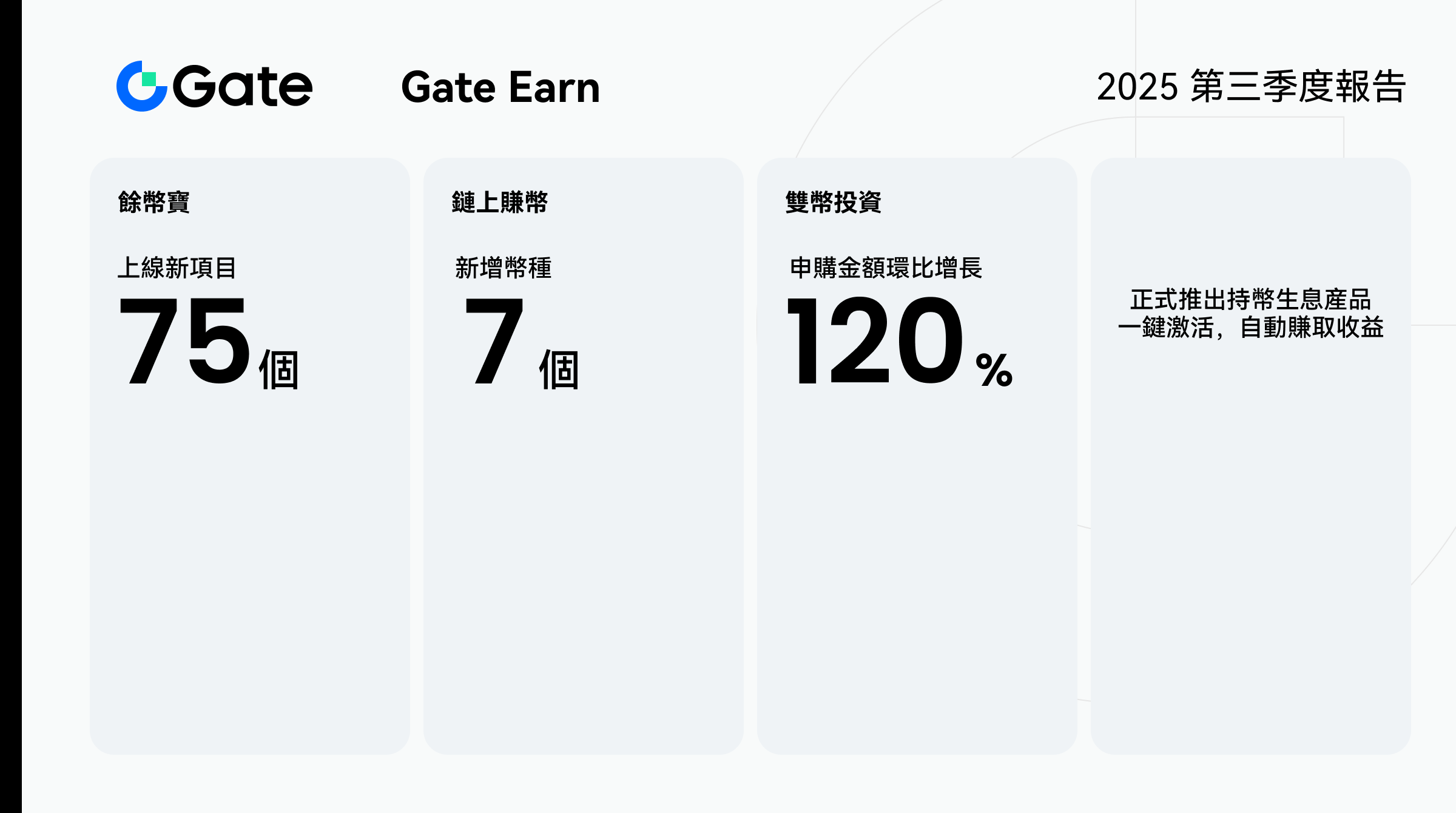 9 月正式推出持幣生息產品,用戶只需一鍵激活,即可透過現貨持倉自動賺取收益,無需鎖倉,資產依舊靈活可用。整體來看,Gate Earn 在產品供給、用戶活躍與資產增長三方面實現協同提速,全面鞏固其在 Gate 平台收益生態中的核心地位。