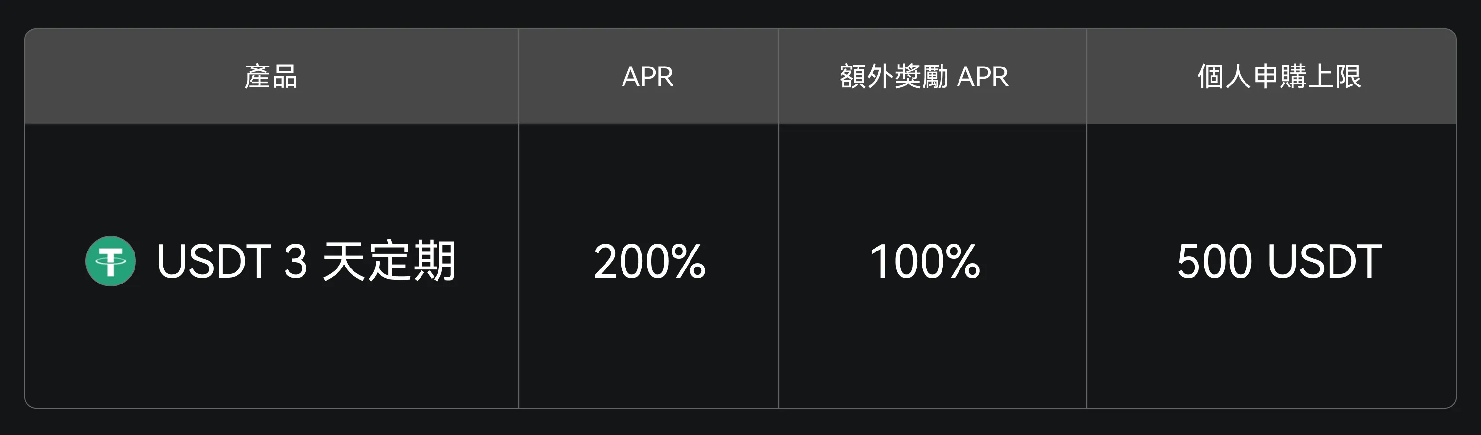 符合活動資格的用戶申購下方產品可享 300% 年化收益, 其中 200% 以 USDT 利息形式發放,100% 以 GT 額外獎勵形式發放。
