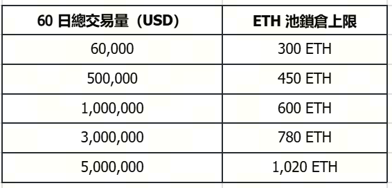 將根據 60 日總交易量確定鎖倉上限。達到更高的交易量,即可解鎖更高的質押額度。