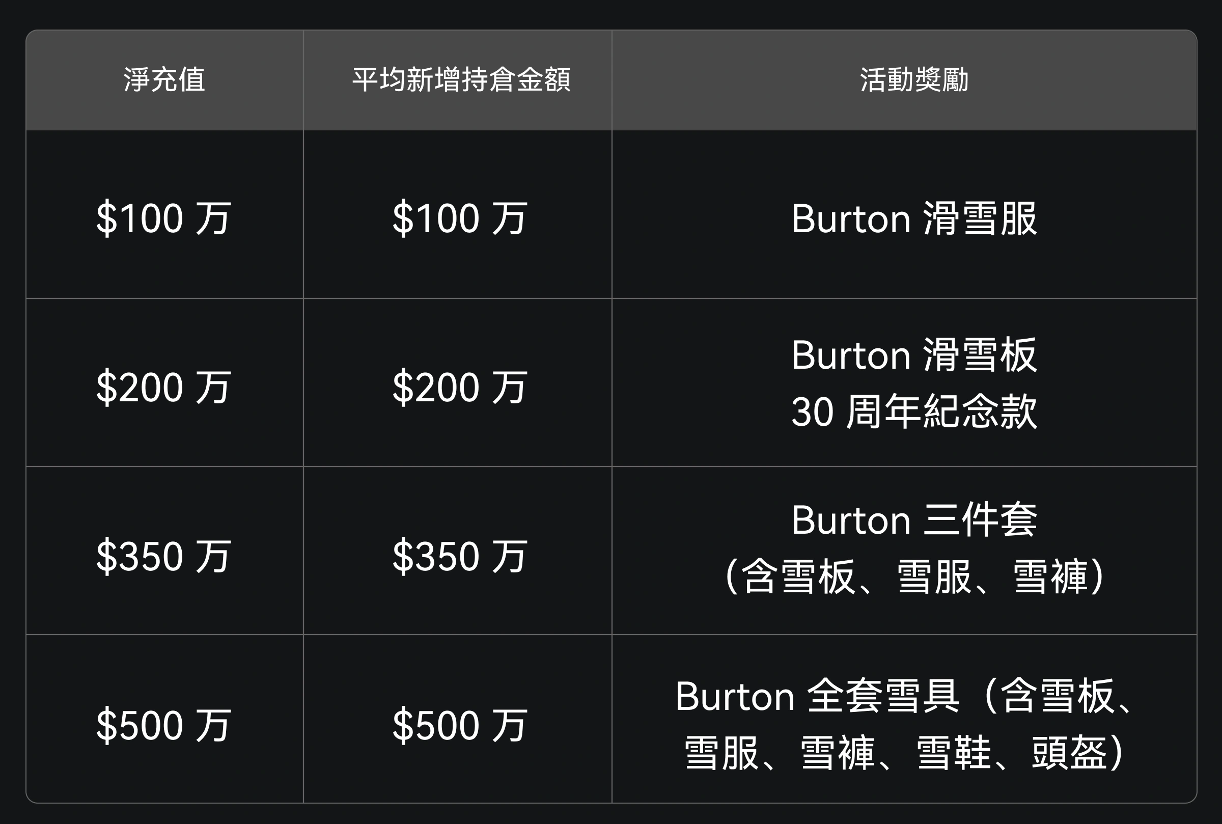 符合活動資格的用戶,若於 11 月 25 日報名參加餘幣寶持倉挑戰賽,且在報名後完成 $500 萬的淨充值,並於 11 月 25 日至 12 月 24 日(共 30 天)期間,在餘幣寶理財中維持 $500 萬的平均新增持倉,即可獲得 Burton 全套雪具(含雪板、雪服、雪褲、雪鞋、頭盔),也可折算成等值的 2,250 USDT。