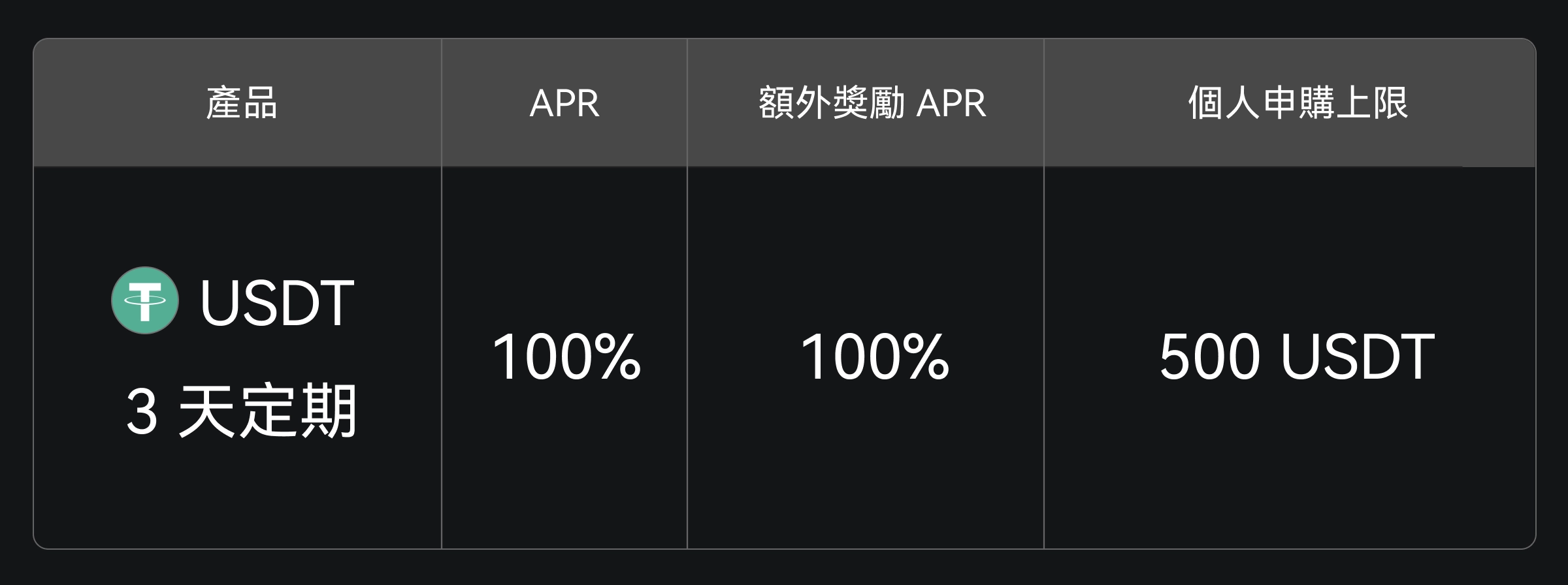 活動前未使用過餘幣寶的用戶,申購 USDT 3 天定期理財可享 200% 年化收益,其中 100% 以 USDT 利息形式發放,100% 以 GT 額外獎勵形式發放。前往申購