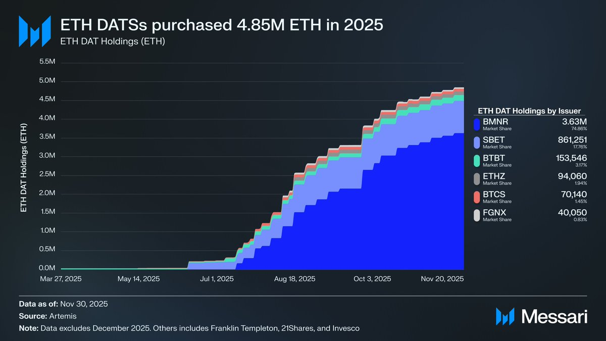 2025 年,DATs 對 ETH 價格產生顯著影響,全年累計買入 480 萬 ETH,佔 ETH 總供應量 4%。其中最活躍的 DAT 為 Tom Lee 創立的 Bitmine (BMNR),這家前比特幣礦企於 2025 年 7 月開始將金庫和資本轉向 ETH。7 月至 11 月間,Bitmine 購入 363 萬 ETH,成為 DAT 市場份額絕對領導者,佔全部 DAT 持有量的 75%。