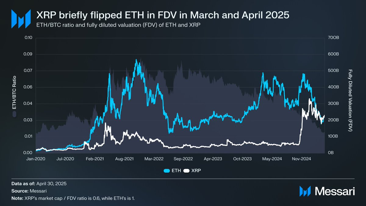 今年上半年,針對 ETH 的討論達到巔峰。3 月,XRP 在完全稀釋估值(FDV)上短暫超越 ETH(需注意,ETH 已全部流通,而 XRP 僅約 60% 供應流通)。