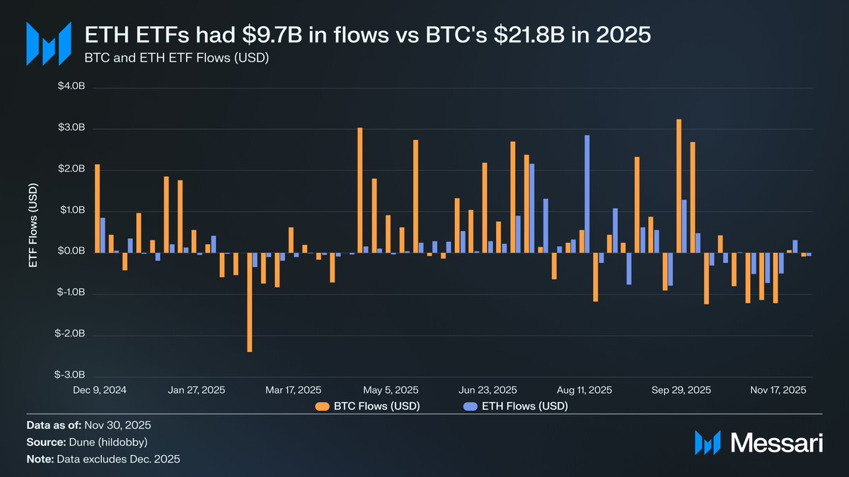 但隨著 ETH 反彈,ETF 流入疑慮徹底逆轉。全年現貨 ETH ETF 吸引 97.2 億美元資金,BTC 則為 217.8 億美元。考慮到 BTC 市值幾乎為 ETH 的五倍,流入差距僅有 2.2 倍,遠低於多數預期。換言之,按市值調整後,ETH 的 ETF 需求高於 BTC,徹底扭轉了機構對 ETH 興趣不足的敘事。部分階段,ETH 甚至超越 BTC。5 月 26 日至 8 月 25 日,ETH ETF 吸引 102 億美元資金,高於同期 BTC 的 97.9 億美元,首次顯現機構需求明顯偏向 ETH。