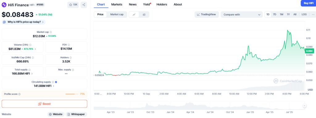 HIFI 從 $0.058 漲到 $0.094,漲幅 62.1%,隨後回落至 $0.084,保持 51.04% 的漲幅。