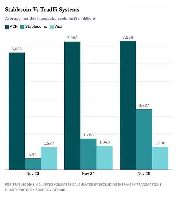 只需瀏覽一下 Artemis 資料集,對比鏈上穩定幣與 Visa、自動清算系統 (ACH) 和其他傳統金融系統的交易量,就能發現它們之間的差距正在迅速縮小。